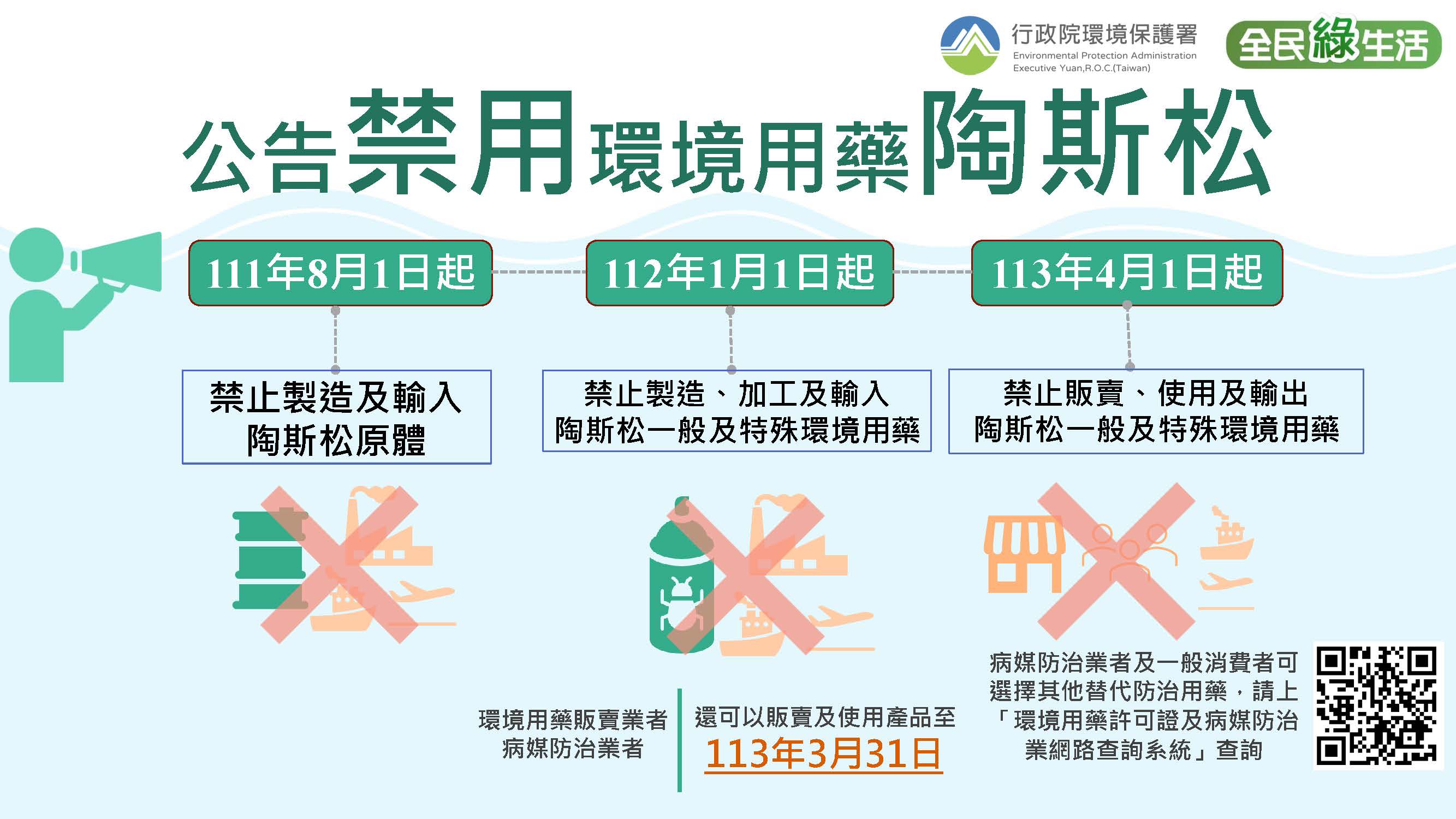 環保署本次公告修正「環境用藥禁止含有之成分及檢驗方法」,其中現有陶斯松環境用藥管制內容及期限,自111年8月1日起禁止陶斯松環境用藥原體製造、加工、輸入;112年1月1日起禁止一般及特殊環境用藥製造、加工、輸入;112年1月1日前製造、加工、輸入之一般及特殊環境用藥自113年4月1日起禁止輸出、販賣、使用,以保障國人健康及維護環境安全。