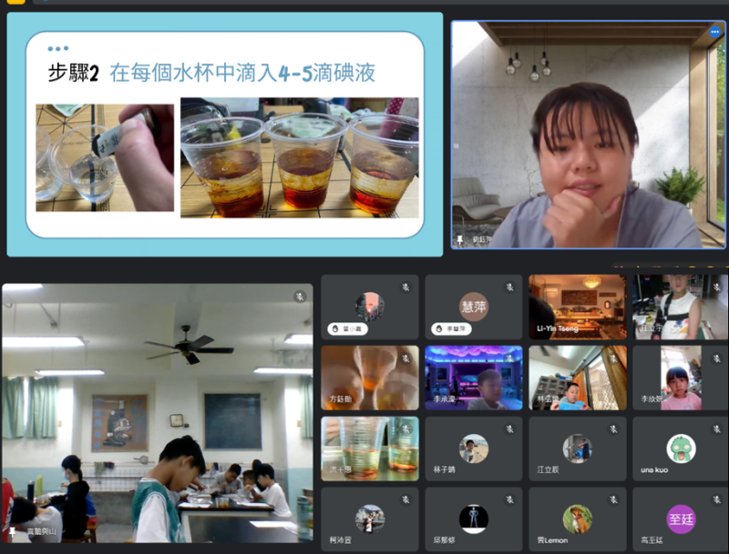 營隊課程_老師進行二氧化硫還原實驗,線上與金門縣中正國小現場學生同時進行