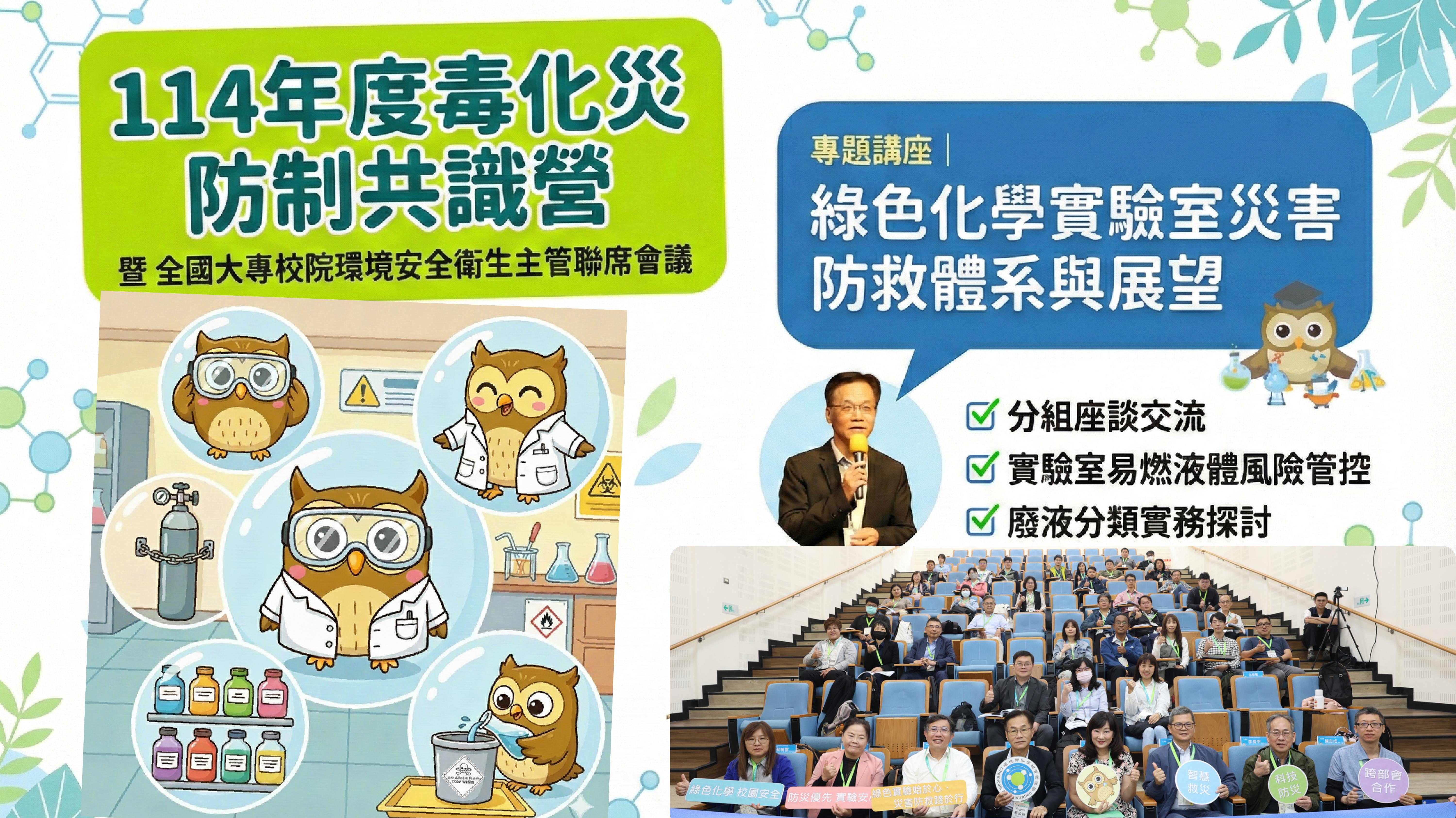 | 活動內容 | 為提升地方環保機關暨大專校院對毒化災防災共識,於114年12月4日至5日辦理114年度毒化災防制共識營,該活動結合教育部「114年度全國大專校院環境安全衛生主管聯席會議」辦理,蔡孟裕署長受邀致詞並針對綠色化學實驗室災害防救體系與展望進行專題演講,會中亦安排分組座談,針對實驗室易燃液體與廢液分類風險進行討論交流,並辦理實驗室意外事故處理演練,強化實驗室安全知識。 |