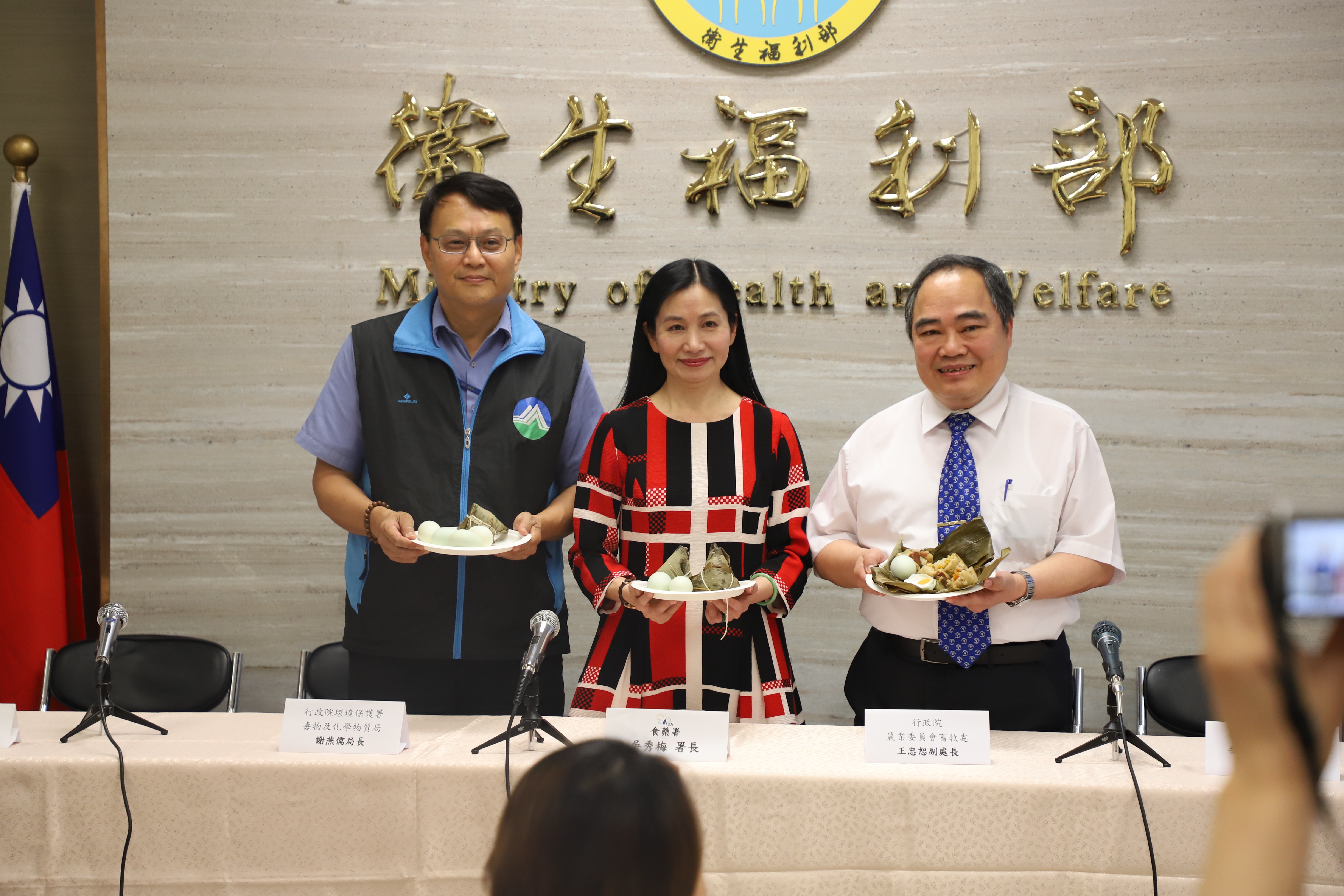 化學局、食藥署、農委會三部會署長官手持端午食材,宣達共同把關食品安全