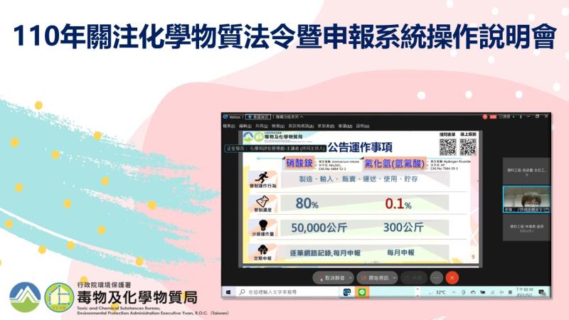 因應110年8月20日「列管關注化學物質及其運作管理事項」增列公告硝酸銨及氫氟酸為具危害性關注化學物質,為利運作業者瞭解法規內容,及於規定期限內完成相關作業,本局訂於111年7月辦理2場「關注化學物質法令暨申報系統操作說明會」。本次說明會分為兩大主題,第一部分為列管硝酸銨及氫氟酸公告重點及應配合事項,包括管制濃度、分級運作量、紀錄、申報、標示等規定。第二部分則是配合新增公告物質,說明關注化學物質申報系統相關功能,包括系統登入、關注化學物質核可文件申請、運作紀錄申報方式等系統操作及注意事項。