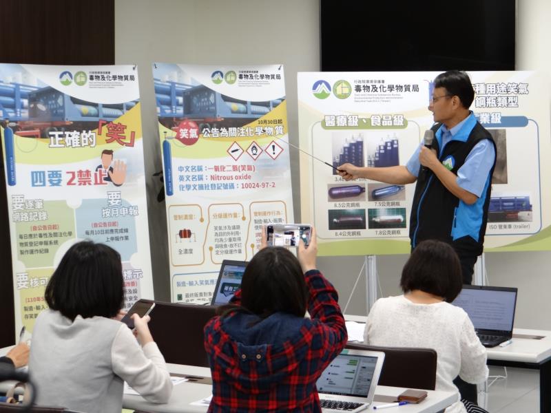 配合本署業已公告一氧化二氮(笑氣)為關注化學物質,為利地方政府依法查處,邀集各環保局召開會議,分享執行情形及稽查經驗,並於今(110)年持續推動化工原(材)料業輔導查核計畫及跨部會聯合稽查專案。