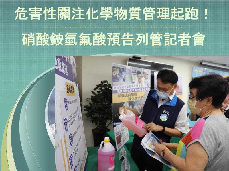 為強化我國硝酸銨及氫氟酸管理,補強流向追蹤及災害預防與應變管理缺口,本署預告列管硝酸銨及氫氟酸為具危害性關注化學物質,期望在各部會權責分工下共同合作,對於具高風險之運作行為加強列管,強化事故風險控管,除要求運作前應取得核可、申報運作資料外,同時禁止於網購平臺交易。以實物展示結合解說操作,供外界瞭解本次預告硝酸銨及氫氟酸為關注化學物質的相關規定與濫用防堵機制。