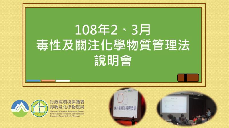 毒性化學物質管理法修正草案已於107年12月21日經立法院三讀通過,108年1月16日總統令公布,名稱修正為「毒性及關注化學物質管理法」(下稱毒管法),為使社會各界瞭解毒管法通過之內容,行政院環境保護署毒物及化學物質局(下稱環保署化學局)特增加召開臺北、新竹、臺中、臺南及花蓮5場次毒管法說明會。